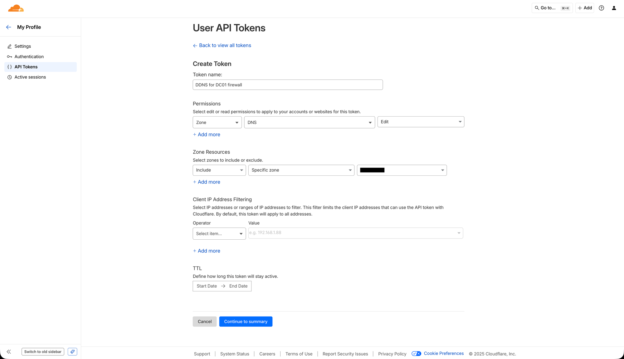Which will specify that the API key will only be able to modify the specific domain’s zone that will be used for the DDNS. Then, you can skip "Client IP Address Filtering" since you don't know what IP address range you can get. You can set a "TTL" if you want, and it's generally recommended for security reasons, but then you really need to remember to manually create a new API token and update your OPNsense DDNS configuration every time it runs out. It should now look something like below.